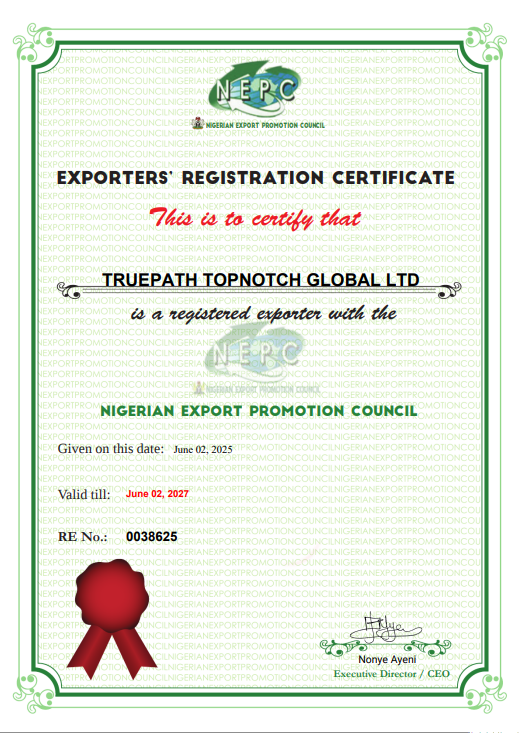 TopNotch -TruePath Global Ltd. is a leading Agricultural and agro allied produce company and leading exporter of high- quality agricultural and agro allied products with headquarters in Nigeria. With a strong commitment to excellence and customer satisfaction, we specialize in sourcing and delivering fresh produce, grains and value-added products to Global market.